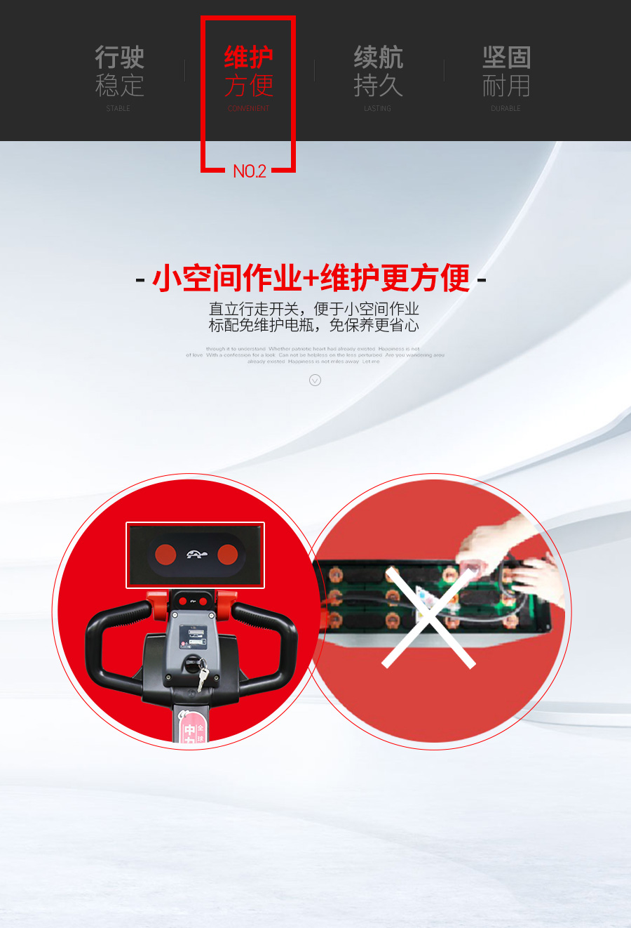 直立行走开关便于作业,免维护电瓶更省心;